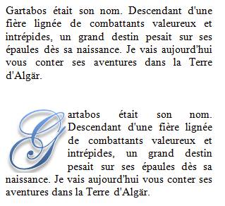 Le choix de la police se fait en déroulant la liste Police. En effet, un aperçu de chaque police y est accessible et il est facile de se faire une idée sur l'allure de la lettrine. Sélectionnez la première lettre du paragraphe concerné, puis affectez-lui la police de votre choix.