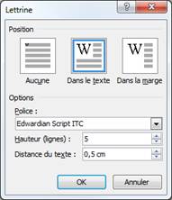 Pour insérer une lettrine, basculez sur l'onglet Insertion du Ruban, cliquez sur Lettrine dans le groupe Texte et choisissez Dans le texte ou Dans la marge. Si la lettrine a tendance à déborder sur le texte, cliquez sur Lettrine, puis sur Options de lettrine, et définissez la hauteur de la lettrine et son éloignement du texte. Cette étape est en particulier nécessaire si la lettrine est affichée en italique et/ou si la police est cursive.