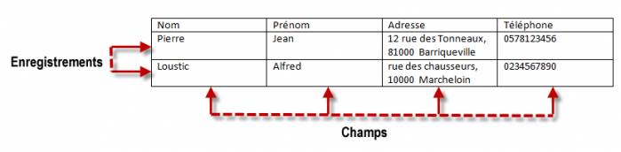 Les champs correspondent aux diverses informations concernant chaque personne. Les enregistrements regroupent les champs relatifs à une même personne. Imaginez par exemple que vous désiriez rassembler le nom, le prénom, l'adresse et le téléphone de plusieurs personnes en vue d'un futur publipostage. Vous aurez autant d'enregistrements que de personnes référencées et chaque enregistrement devra renseigner les champs Nom, Prénom, Adresse et Téléphone. Ici par exemple, le tableau contient deux enregistrements remplis avec des données fantaisistes. La première ligne correspond au titre des champs. Elle permettra de les identifier lors du publipostage.