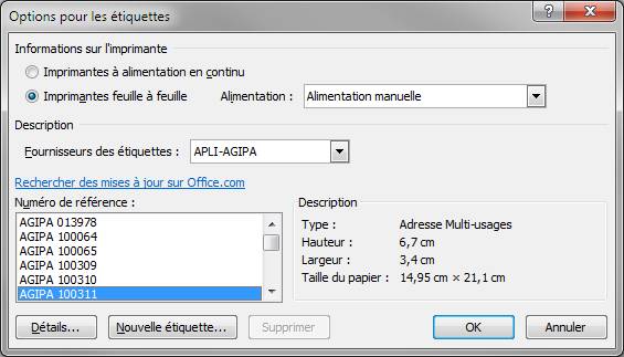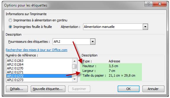 Choisissez un fournisseur d'étiquettes et un numéro de référence pour les étiquettes (ce numéro devrait se trouver sur l'emballage des étiquettes). Ces deux informations indiquées, vérifiez que la hauteur et la largeur des étiquettes est bien conforme à ces dernières.