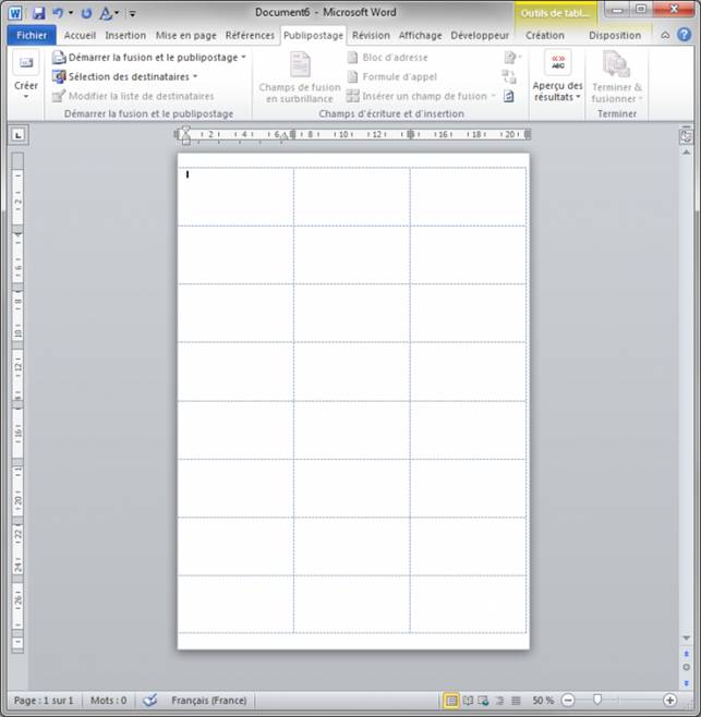 Cliquez sur OK. Les limites des étiquettes apparaissent immédiatement dans le document et un point d'insertion clignotant vous laisse entendre que Word attend des données pour compléter les étiquettes :