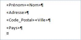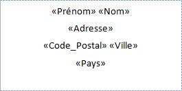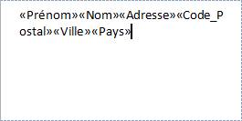 Double-cliquez successivement sur les champs Prénom, Nom, Adresse, Code_Postal, Ville puis Pays. La première étiquette doit maintenant ressembler à ceci :