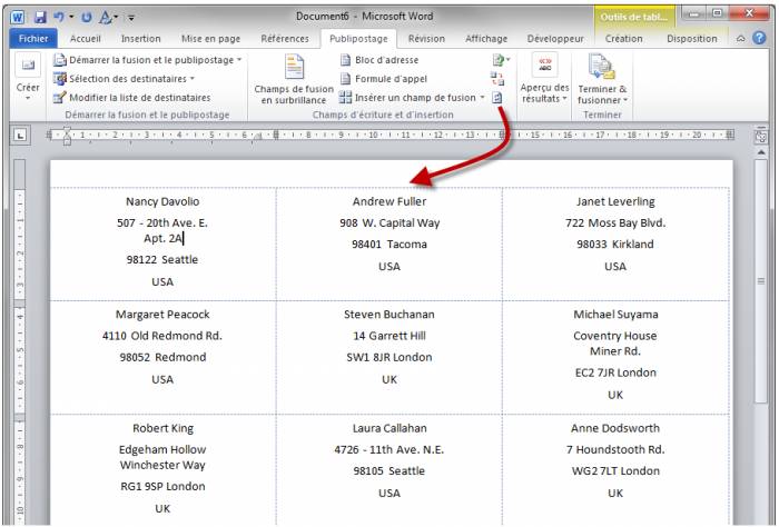 Les données concernant les destinataires ont été définies et le modèle d'étiquettes à utiliser a été spécifié. Il ne reste plus qu'à relier ces deux éléments entre eux pour que Word puisse compléter les étiquettes.