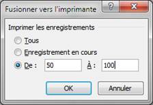 Il est possible de n'imprimer que certains enregistrements en précisant les bornes inférieure et supérieure. Cliquez sur l'icône Terminer et fusionner (onglet Publipostage, groupe Terminer) et choisissez Imprimer les documents dans le menu. Dans la boîte de dialogue affichée, sélectionnez l'option De et remplissez les deux zones de texte. A titre d'exemple, pour imprimer les enregistrements 50 à 100, voici comment la boîte de dialogue doit être paramétrée