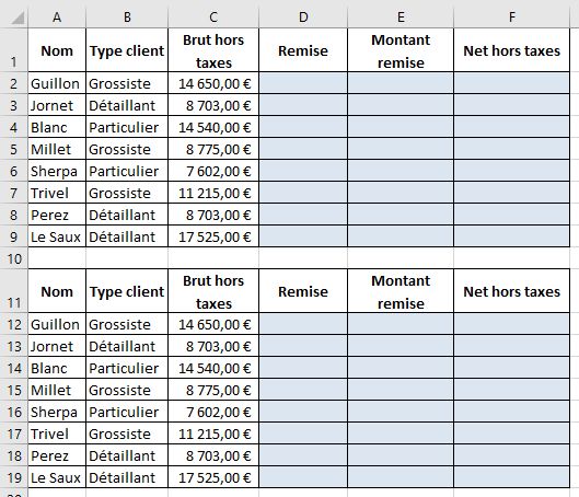 Reproduisez le tableau ci-dessous sur une feuille Excel ou téléchargez le fichier de travail ci-contre.
