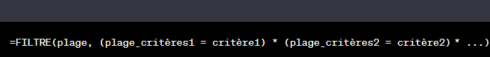 Tapez la formule FILTRE. La syntaxe de la fonction FILTRE est la suivante :