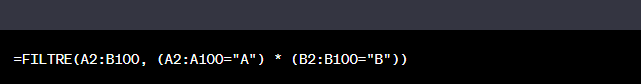 Par exemple, si vous voulez filtrer les données où la colonne A est égale à "A" et la colonne B est égale à "B", votre formule ressemblera à ceci :