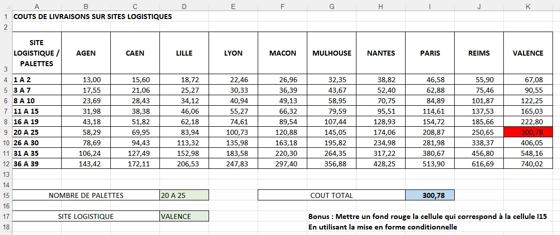 L'objectif est d'obtenir rapidement le coût total en I15 à partir de la sélection du nombre de palettes à envoyer et du site de destination. Vous utilisez deux listes déroulantes à créer en D15 et en D17
