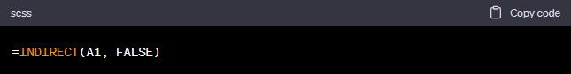 [a1] : C'est un argument facultatif. Si [a1] est VRAI ou omis, réf_texte est interprété en tant qu'adresse de cellule au format A1 (par exemple, A1, B2, C3, etc.). Si [a1] est FAUX, réf_texte est interprété en tant qu'adresse de cellule au format R1C1 (par exemple, R1C1, R2C2, R3C3, etc.).