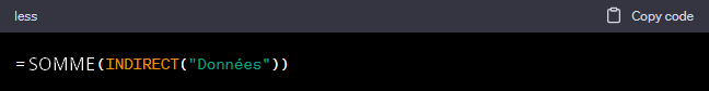 Supposons que vous ayez une plage de cellules nommée "Données" (qui va de A1 à A10). Si vous voulez additionner les valeurs de cette plage en utilisant INDIRECT, vous pouvez faire :