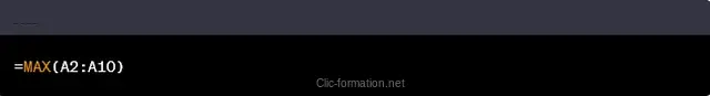 Dans cet exemple, la plage est A2:A10, ce qui signifie que nous recherchons le chiffre le plus élevé parmi les valeurs contenues dans ces cellules.