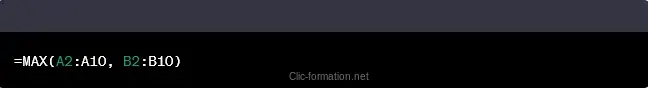 La fonction MAX peut également être utilisée avec des plages non adjacentes. Par exemple, si vous avez des chiffres dans les cellules A2:A10 et B2:B10, vous pouvez utiliser la fonction MAX de cette manière :