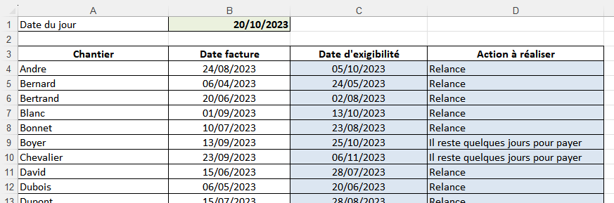 En colonne D si les 30 jours ouvrés sont dépassés, faire apparaitre RELANCE, si les 30 jours ne sont pas dépassés, faire apparaître IL RESTE QUELQUES JOURS POUR PAYER.