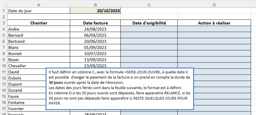 Il faut définir en colonne C, avec la formule =SERIE.JOUR.OUVRE, à quelle date il est possible d'exiger le paiement de la facture si on prend en compte la durée de 30 jours ouvrés après la date de l'émission.