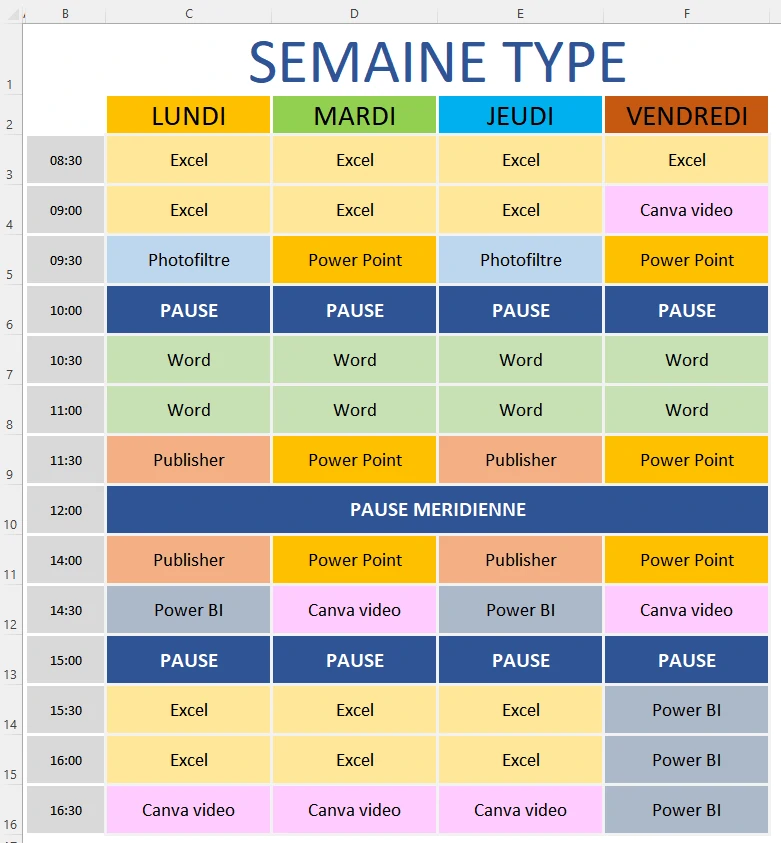 Vous téléchargez le fichier Excel ci-contre. Les données du planning sont saisies. Vous effectuez la mis en forme.![]()