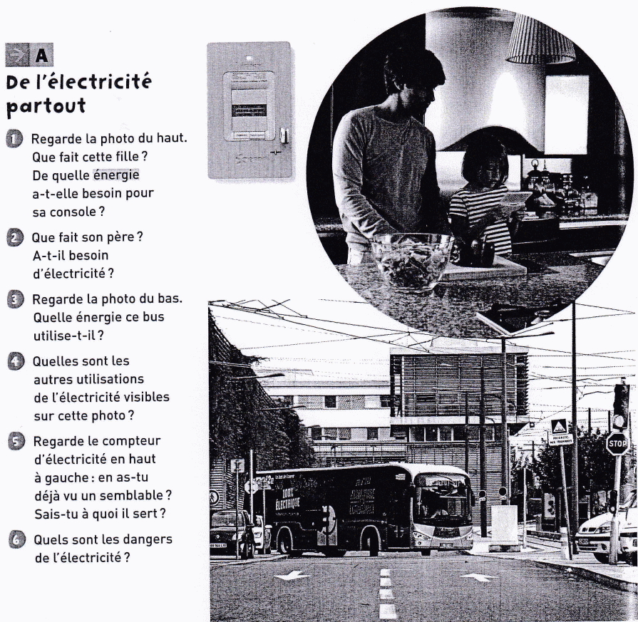 L'électricité permet d'éclairer la maison, de cuire les aliments, de faire fonctionner la télévision, l'ordinateur, la machine à laver. Elle est présente partout : dans la classe, les magasins, les bureaux et les usines, dans les rues, pour les feux tricolores et l'éclairage la nuit... Elle fait avancer les véhicules électriques, les métros, les tramways et les trains.