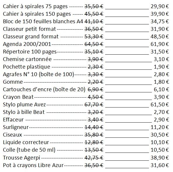 Utiliser les tabulations « 8 » et « 14 » avec point de suite « tiret » entre la dénomination et le prix et « trait » entre le prix et le prix remisé. Bien prendre en compte l'alignement à droite des colonnes de chiffres.