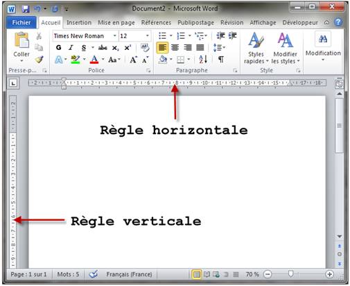 Les règles sont affichées dans les parties gauche et supérieure du document en mode d'affichage Page. Elles permettent de visualiser les éléments qui composent le document, tels qu'ils seront imprimés.