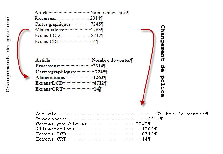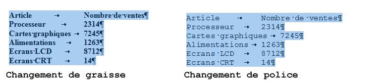 Dans l'exemple qui suit, des données textuelles sont alignées visuellement en insérant plusieurs espaces. Tout a l'air de bien se passer jusqu'à ce que l'on décide de changer la graisse des caractères en cliquant sur l'icône Gras du Ruban, ou que l'on choisisse une autre police !