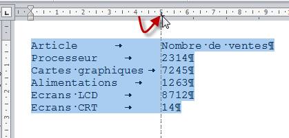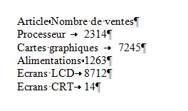 Les plus observateurs d'entre vous auront certainement remarqué que le nombre de ventes des cartes graphiques n'est pas aligné avec les autres données numériques. Ceci est dû à la position de la tabulation. Le bloc de texte étant sélectionné, décalez la tabulation vers la droite d'un centimètre en utilisant la technique de glisser-déposer de Windows et le problème est réglé.
