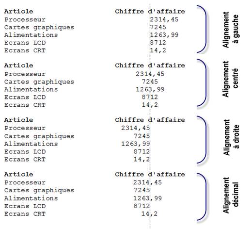 Dans d'autres situations, les tabulations à gauche, à droite ou centrées pourront mieux mettre en valeur les données. A vous de vous adapter en fonction du contexte.