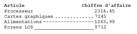 Les tabulations avec alignement décimal sont certainement les mieux adaptées à ce cas précis, car les sommes en euros apparaissent clairement, indépendamment du nombre de décimales.