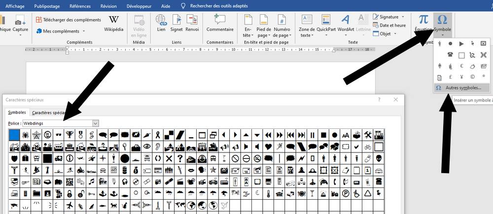 Menu insertion-->Symbole-->Autres symboles-->sélection de la police.