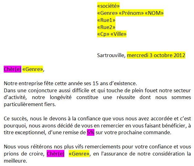 La difficulté de cet exercice réside dans l'insertion du champ "date du jour" et surtout l'insertion des champs identifiés en violet qui sont conditionnels. C'est-à-dire que la civilité évoluera en fonction du champ "genre" et que les établissements qui ont un CA de plus de 15000€ bénéficie d'une remise de 10% les autres de 5%