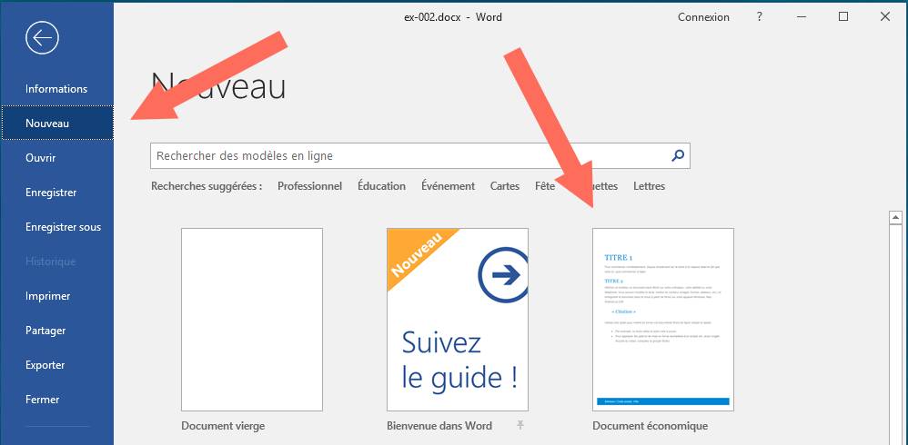 Vous ouvrez un nouveau document à partir de la bibliothèque d'Office. Sur l'exemple le modèle "économique".