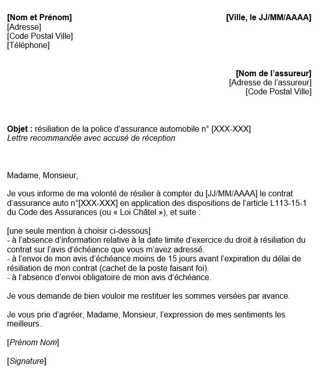 Je vous informe de ma volonté de résilier à compter du [JJ/MM/AAAA] le contrat d’assurance auto n°[XXX-XXX] en application des dispositions de l’article L113-15-1 du Code des Assurances (ou « Loi Châtel »), et suite :