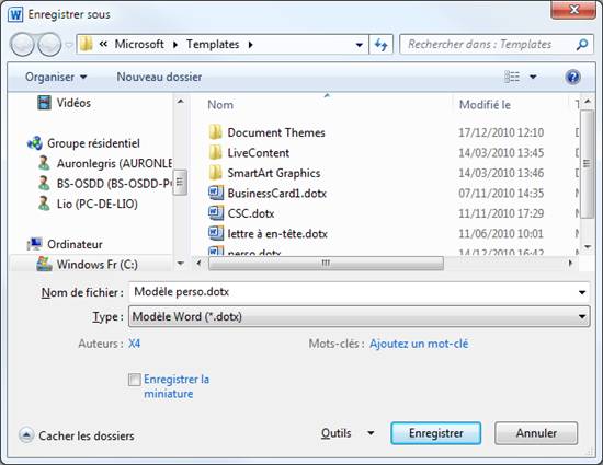 o Stockez le document dans le dossier Users\utilisateur\AppData\Roaming\Microsoft\Templates (où utilisateur est votre nom d'utilisateur sous Windows).