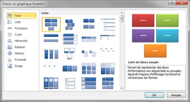 Les graphiques SmartArt sont utilisés pour présenter des informations et idées sous une forme graphique. Sans nécessiter de compétences graphiques, ils apportent pourtant une touche professionnelle à vos documents et facilitent la compréhension et la mémorisation des informations par le lecteur. Pour insérer un graphique SmartArt dans un document, commencez par placer le point d'insertion à l'emplacement voulu. Basculez sur l'onglet Insertion dans le Ruban et cliquez sur l'icône SmartArt dans le groupe Illustrations. Une boîte de dialogue intitulée Choisir un graphique SmartArt est affichée.