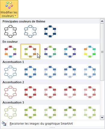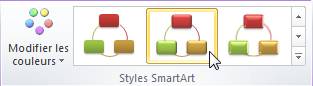 Commencez par double-cliquer sur un emplacement non occupé du graphique SmartArt pour faire apparaître l'onglet Création dans le Ruban. Cliquez sur l'icône Modifier les couleurs dans le groupe Styles SmartArt et choisissez la deuxième icône dans la catégorie En couleur.