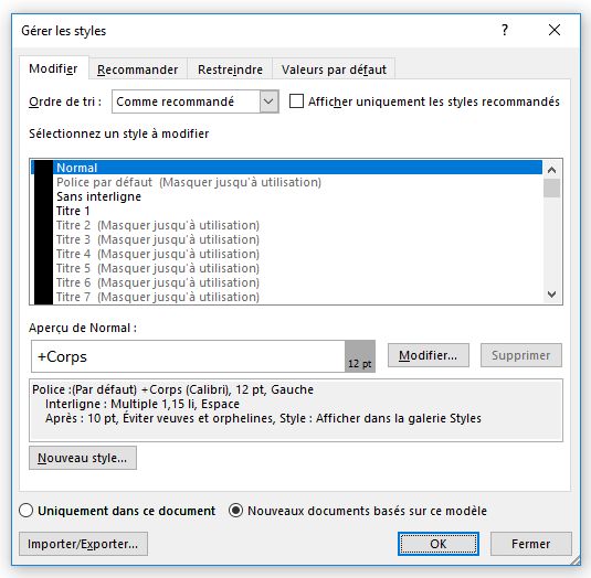 Avec le raccourci CTRL+Maj+ALT+S, vous accédez à la boite de dialogue de modification des styles. Vous choisissez le style normal que vous avez modifié en fonction de la capture écran ci-dessous.