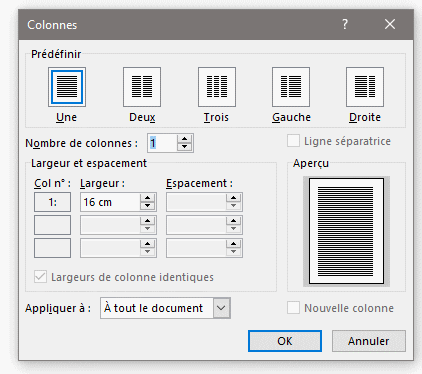 Vous pouvez appliquer des colonnes à tout le document ou à une partie de celui-ci.