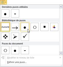 Pour définir une nouvelle liste à puces, cliquez sur la flèche, à droite de l'icône Puces (groupe Paragraphe, onglet Accueil du Ruban) et choisissez une puce dans le menu.
