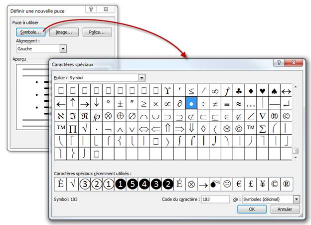Si les puces proposées par défaut par Word ne sont pas suffisantes, cliquez sur la flèche à droite de l'icône Puces et choisissez Définir une puce dans le menu. Cette action affiche la boîte de dialogue Définir une nouvelle puce. Vous pouvez cliquer sur Symbole pour utiliser un caractère quelconque d'une des polices installées.