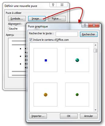 Si vous préférez utiliser des symboles graphiques, cliquez sur Image dans la boîte de dialogue Définir une nouvelle puce et faites votre choix dans la boîte de dialogue Puce graphique.