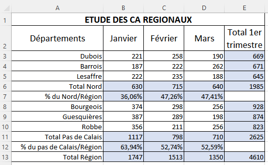- Le Total Région est la somme des deux précédents (à recopier vers la droite) = B7+B12