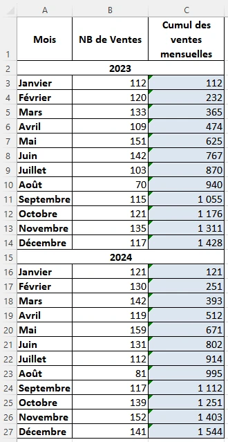 C12 correspond au mois de Janvier C3 au cumul de Janvier et Février, et ainsi de suite