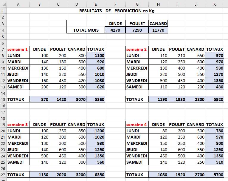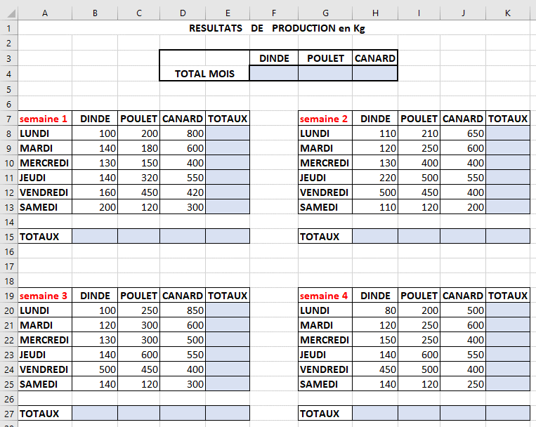Toutes les cellules bleues sont à compléter avec une addition ou la fonction SOMME