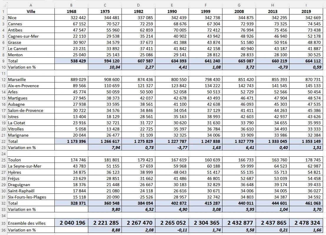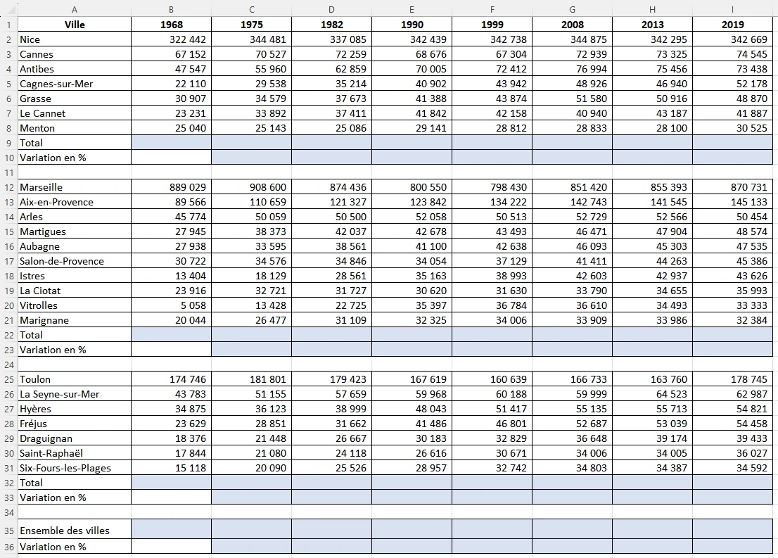 Toutes les cellules bleues sont à compléter avec une addition ou la fonction SOMME (conseillé). La variation en % est à calculer en fonction de l'année précédente. Ci dessous un indice sérieux pour la cellule C10. À tenter avant de regarder :)