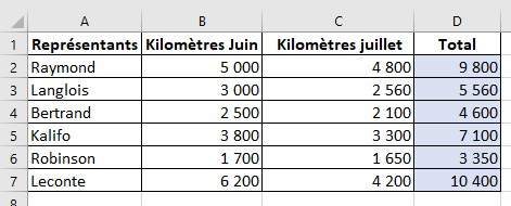 En D2 il faudra donc insérer l'oprétation "=B2+C2", en D3: "=B3+C3" ...