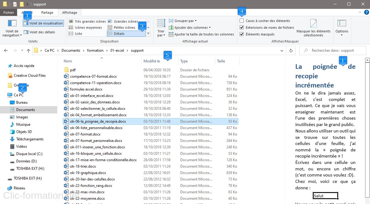 Repère 4 : Choisir ou pas d'afficher les extensions de fichiers et les éléments masqués (fichiers Windows principalement). Dans l'exemple, les extensions sont visibles sur chaque fichier.