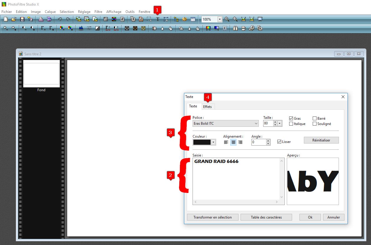 Un onglet « Effets » permet de modifier l’opacité, d’ajouter une ombre portée, d’ajouter un contour, un biseau ou/et de remplir le texte.
