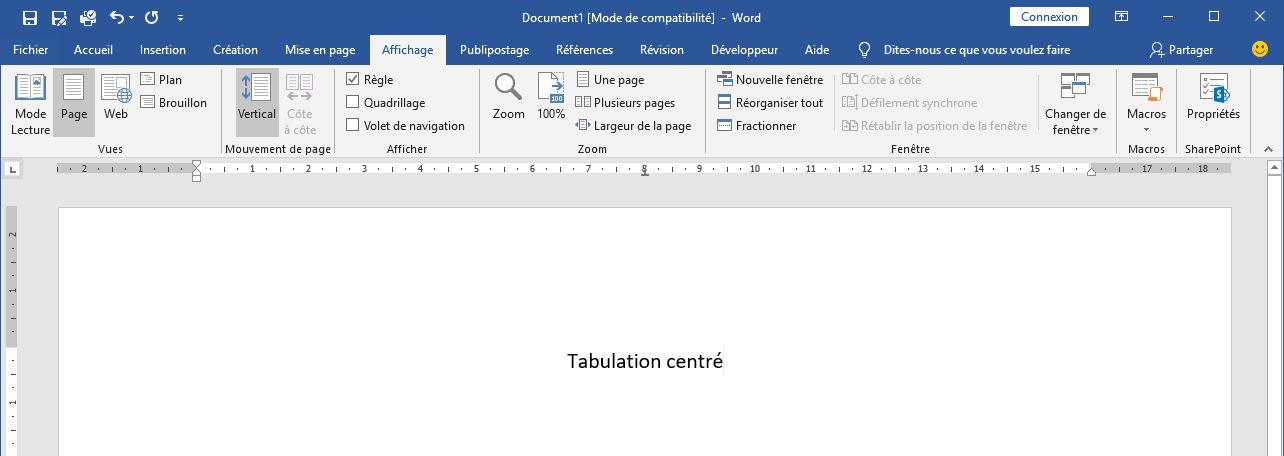 Faites apparaitre les règles supérieures et insérez une tabulation au centre de la page. Vous insérez le texte que vous souhaitez et le centré