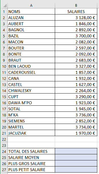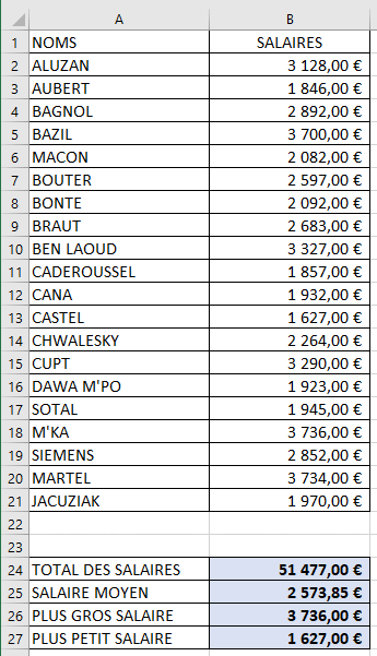 Vous utilisez successivement les fonctions SOMME, (division combinée avec NB), MAX et MIN.
