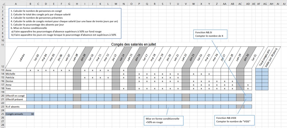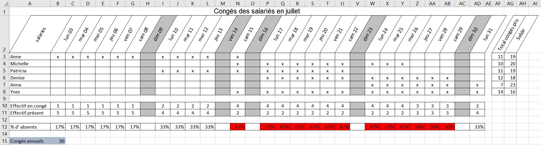4. Calculer le solde de congés restant pour chaque salarié (sur une base de trente jours par an)
