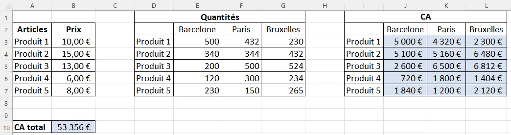 En J3:L7, vous calculez le CA par produit et par ville grâce à l'outil matriceEn B10 vous calculez le CA total grâce à l'outil matrice