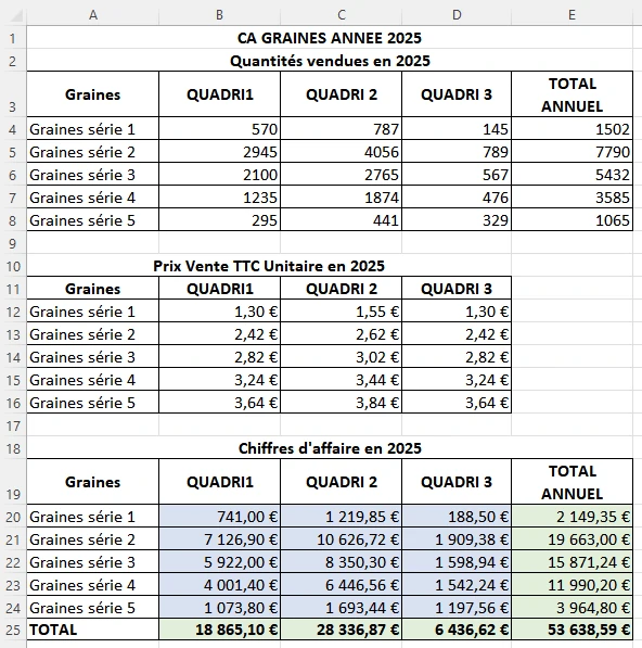 Cellule B20:D24, vous déployez un calcul matriciel pour remplir le tableauColonne E et ligne 25 : SOMME classique.